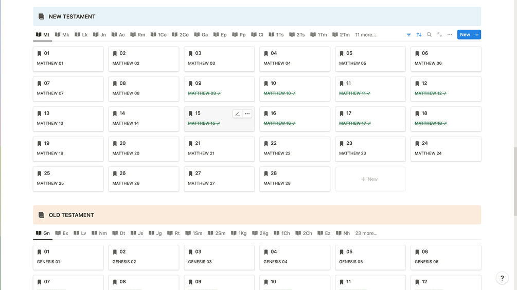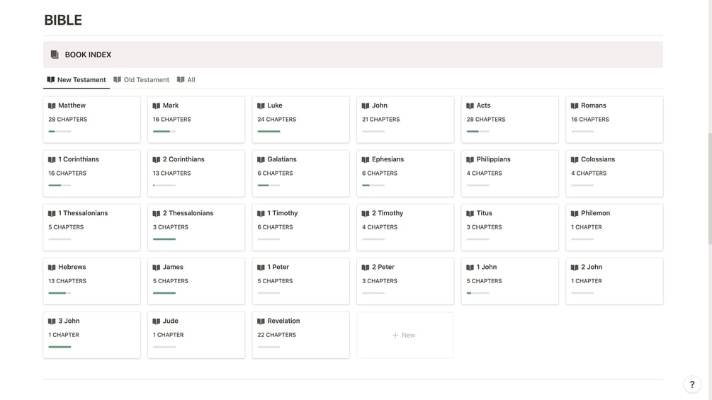 • Organized Structure: Books and chapters are meticulously grouped into "New Testament," "Old Testament," and "Entire Bible," making navigation and reading progress tracking through intuitive progress bars easy.