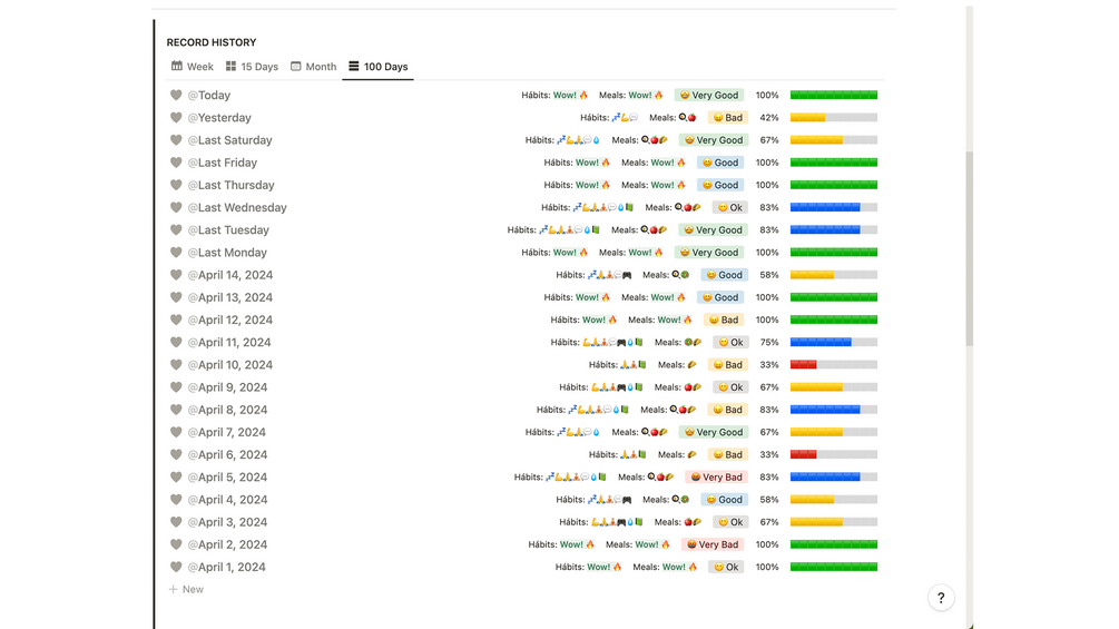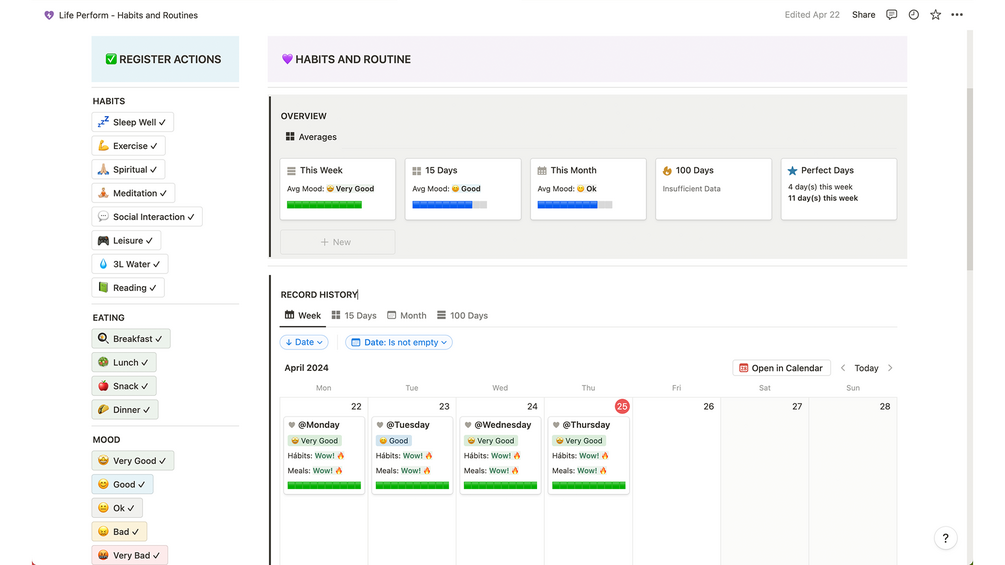 This template is designed to be your ally in building and maintaining new habits, promoting a healthier and fuller life. With an automated and intuitive interface, you can easily monitor your habits, meals, and mood states, gaining a clear and detailed view of your progress and performance. Organize your meal plan, structure your workouts, set and track personal goals effortlessly, and take on the 100-day challenge to boost your quality of life.
